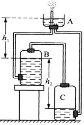 (4分)如图所示是利用塑料瓶、塑料管、橡皮塞等材料制作的小喷泉装置。其中A是用一个塑料瓶割去瓶底部分后留下的瓶嘴部分。B、C是两个侧壁上有一个圆孔的塑料瓶。先把图示中B瓶装满水,C瓶不加水,再往A中加一些水,不要让水没过喷嘴。当A中的水流到C中时,就可以看到喷泉了。