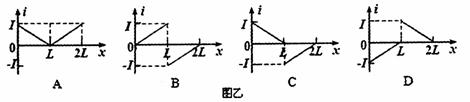 如图甲所示,等腰直角三角形区域内分布有垂直于纸面向外的匀强磁场,它的一条直角边在z轴上且长为L.纸面内一边长为L的正方形导线框沿x轴正方向做匀速直线运动穿过匀强磁场区域,在t=0时刻恰好位于图甲中所示的位置.以顺时针方向为导线框中电流的正方向,在图乙中能够正确表示电流一位移(i-x)关系的是