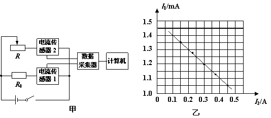 某同学发现上述器材中虽然没有电压传感器,但给出了两个电流传感器,于是他设计了如图甲所示的电路来完成实验。