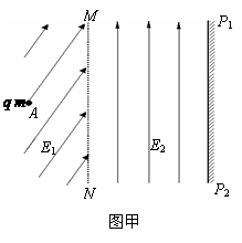 25、(18分)、如图甲所示,在边界MN左侧存在斜方向的匀强电场E1,在MN的右侧有竖直向上、场强大小为E2=0.4N/C的匀强电场,还有垂直纸面向内的匀强磁场B(图甲中未画出)和水平向右的匀强电场E3(图甲中未画出),B和E3随时间变化的情况如图乙所示,P1P2为距MN边界2.28m的竖直墙壁,现有一带正电微粒质量为4×10-7kg,电量为1×10-5C,从左侧电场中距MN边界