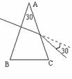 18、如图所示,三棱镜的顶角是300,光线从AB面垂直射入,由AC面射出,测得出射光线与入射光线的夹角为300,则该三棱镜的折射率n为多少?
