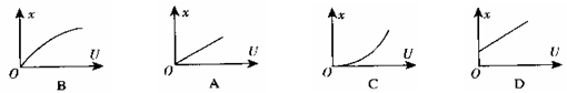 质谱仪的两大重要组成部分是加速电场和偏转磁场.如图为质谱仪的原理图,设想有一个静止的质量为m、带电量为q的带电粒子(不计重力),经电压为U的加速电场加速后垂直进入磁感应强度为B的偏转磁场中,带电粒子打至底片上的P点,设OP = x,则在图中能正确反映x与U之间的函数关系的是 ( )