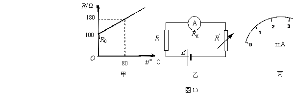 (Ⅱ).(9分)一些材料的电阻随温度的升高而变化。如图15(甲)是由某金属材料制成的电阻R随摄氏温度t变化的图像,若用该电阻与电池(电动势E=1.5V,内阻不计)、电流表(量程为5mA、内阻不计)、电阻箱R′ 串联起来,连接成如图(乙)所示的电路,用该电阻做测温探头,把电流表的电流刻度改为相应的温度刻度,就得到了一个简单的“金属电阻温度计”。