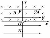 12.( 18分)如图所示,竖直平面xOy内存在水平向右的匀强电场,场强大小E=10 N/C,在y≥0的区域内还存在垂直于坐标平面向里的匀强磁场,磁感应强度大小B=0.5 T.一带电量q=+0.2 C、质量m=0.4 kg的小球由长l=0.4 m的细线悬挂于P点,小球可视为质点,现将小球拉至水平位置A无初速释放,小球运动到悬点P正下方的坐标原点O时,悬线突然断裂.(g=10 m/s2)求: