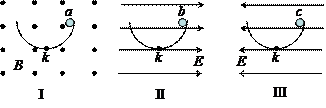 26.[浙江省温州八校2011届高三上学期期末联考试题]如图所示,Ⅰ、Ⅱ、Ⅲ是竖直平面内三个相同的半圆形光滑轨道,K为轨道最低点,Ⅰ处于匀强磁场中,Ⅱ和Ⅲ处于匀强电场中,三个完全相同的带正电小球a、b、c从轨道最高点自由下滑至第一次到达最低点k的过程中,下列说法中正确的有( )
