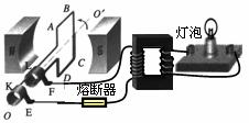 T的水平匀强磁场中,线框面积S=0.5m2,线框电阻不计。线框绕垂直于磁场的轴OO′以角速度ω=200rad/s匀速转动,并与理想变压器原线圈相连,副线圈线接入一只“220V,60W”灯泡,且灯泡正常发光,熔断器允许通过的最大电流为10A,下列说法正确的是 ( CD )