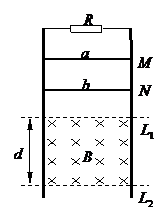 44.[江苏省盐城中学2011届高三一模]如图所示,电阻忽略不计的、两根两平行的光滑金属导轨竖直放置,其上端接一阻值为3Ω的定值电阻R。在水平虚线L1、L2间有一与导轨所在平面垂直的匀强磁场B,磁场区域的高度为d=0.5m。导体棒a的质量ma=0.2kg、电阻Ra=3Ω;导体棒b的质量mb=0.1kg、电阻Rb=6Ω,它们分别从图中M、N处同时由静止开始在导轨上无摩擦向下滑动,都能匀速穿过磁场区域,且当b 刚穿出磁场时a正好进入磁场.设重力加速度为g=10m/s2,不计a、b棒之间的相互作用。导体棒始终与导轨垂直且与导轨接触良好。求: