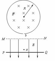 (16分)如图所示,直线MN的下方有竖直向下的匀强电场,场强大小为E=700V/m。在电场区域内有一个平行于MN的挡板PQ;MN的上方有一个半径为R=0.866m的圆形弹性围栏,在围栏区域内有图示方向的匀强磁场,磁感应强度大小为B=1.4T。围栏最低点一个小洞b,在b点正下方的电场区域内有一点a,a点到MN的距离d1=45cm,到PQ距离d2=5cm。现将一个质量为m=0.1g ,带电量q=2×10-3C的带正电小球(重力不计),从a点由静止释放,在电场力作用下向下运动与挡板PQ相碰后电量减少到碰前的0.8倍,且碰撞前后瞬间小球的动能不变,不计小球运动过程中的空气阻力以及小球与围栏碰撞时的能量损失,试求:(已知