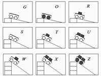 装载物体的质量越大,到达斜面底部的速度越快。图示为两种不同直径车轮(颜色不同),装有不同木块(每个木块的质量相同)从不同高度释放的小车。你认为小明应该选用哪3种情况进行比较( )