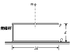 14.(16分)如图所示,完全相同的金属板P、Q带等量异种电荷,用绝缘杆将其连成一平行正对的装置,放在绝缘水平面上,其总质量为M,两板间距为d,板长为2d,在P板中央位置处有一小孔.一质量为m、电量为+q的粒子,从某一高度下落通过小孔后进入PQ,恰能匀速运动.外部的电场可忽略,板间电场可视为匀强电场,重力加速度为g,求: