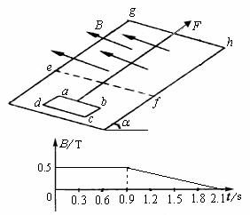 =30°,在斜面上放置一矩形线框abcd,ab边的边长l1=lm,bc边的边长l2=0.6m,线框的质量m=1kg,电阻R=0.1Ω,线框受到沿光滑斜面向上的恒力F的作用,已知F=10N.斜面上ef线(ef∥gh)的右方有垂直斜面向上的均匀磁场,磁感应强度B随时间t的变化情况如B-t图象,时间t是从线框由静止开始运动时刻起计的.如果线框从静止开始运动,进入磁场最初一段时间是匀速的,ef线和gh的距离s=5.1m,求: