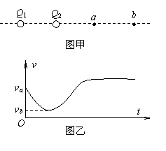 如图甲所示,Q1、Q2为两个被固定的点电荷,其中Q1带负电,a、b两点在它们连线的延长线上。现有一带负电的粒子以一定的初速度沿直线从a点开始经b点向远处运动(粒子只受电场力作用),粒子经过a、b两点时的速度分别为va、vb,其速度图像如图乙所示.以下说法中正确的是