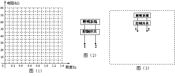 ⑵如图(2)所示,当1、2两端所加电压上升至2V时,控制开关自动启动照明系统。请利用下列器材设计一个简单电路,给1、2两端提供电压,要求当天色渐暗,照度降低至1.0(1x)时启动照明系统,在图(3)虚线框内完成电路原理图(不考虑控制开关对所设计电路的影响),提供的器材如下: