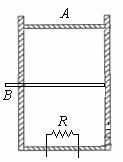 真空中有一足够高的绝热筒状汽缸,如图,最初活塞A由支架固定住,其下容积为10L,由隔板B均分为两部分:上半部分真空,下半部分有1mol的氧气,温度为27°C.抽开B,气体充满A的上半部分,平衡后,气体对A的压力刚好与A的重力平衡.再用电阻丝R给气体加热,使气体等压膨胀到20L,下列说法正确的是 (