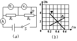 在如图(a)所示的电路中,R1为定值电阻,R2为滑动变阻器。闭合电键S,将滑动变阻器的滑动触头P从最右端滑到最左端,两个电压表的示数随电路中电流变化的完整过程图线如图(b)所示。则