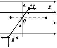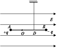 32.如图所示,绝缘轻杆长L=0.9m,两端分别固定着带等量异种电荷的小球A、B,质量分别为mA=4×10-2kg,mB=8×10-2kg,A球带正电,B球带负电,电荷量q=6.0×10-6C。轻杆可绕过O点的光滑水平轴转动,OB=2OA。一根竖直细线系于杆上OB中点D使杆保持水平,整个装置处在水平向右的匀强电场中,电场强度E=5×104N/C。不计一切阻力,取g=10m/s2,求: