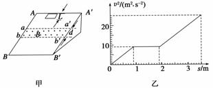 33.(14分)如图甲所示,一个质量m=0.1 kg的正方形金属框总电阻R=0.5 Ω,金属框放在表面绝缘且光滑的斜面顶端(金属框上边与AA′重合),自静止开始沿斜面下滑,下滑过程中穿过一段边界与斜面底边BB′平行、宽度为d的匀强磁场后滑至斜面底端(金属框下边与BB′重合),设金属框在下滑过程中的速度为v,与此对应的位移为s,那么v2-s图象(记录了线框运动全部过程)如图乙所示,已知匀强磁场方向垂直斜面向上。试问:(g取10m/s2)