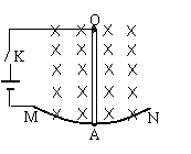 如图所示,一根均匀导体棒OA长为L,质量为m,上端与水平固定转轴O连接,下端与圆弧金属导轨MN良好接触,不计摩擦和导轨电阻.匀强磁场的磁感应强度为B,方向水平.闭合电键K,OA从竖直方向偏离角度为q后静止,则电路中的电流为________;现使OA从竖直方向偏离角度为2q后静止,若其它条件不变,则磁感应强度应变为___________.