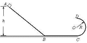 (16分)如图所示,在竖直平面内,由倾斜轨道AB、水平轨道BC和半圆形轨道CD连接而成的光滑轨道,AB与BC的连接处是半径很小的圆弧,BC与CD相切,圆形轨道CD的半径为R。质量为m的小物块从倾斜轨道上距水平面高为h=2.5R处由静止开始下滑。求: