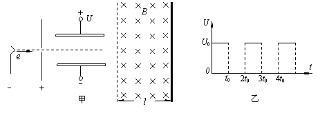24.(20分)如图所示装置由加速电场、偏转电场和偏转磁场组成。偏转电场处在加有电压的相距为d的两块水平平行放置的导体板之间,匀强磁场水平宽度为l,竖直宽度足够大,处在偏转电场的右边,如图甲所示。大量电子(其重力不计)由静止开始,经加速电场加速后,连续不断地沿平行板的方向从两板正中间射入偏转电场。当两板没有加电压时,这些电子通过两板之间的时间为2t0,当在两板间加上如图乙所示的周期为2t0、幅值恒为U0的电压时,所有电子均能通过电场,穿过磁场,最后打在竖直放置的荧光屏上(已知电子的质量为m、电荷量为e)。求: