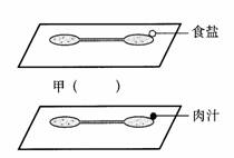 42.回忆我们所做的探究,图甲、乙表示两块载玻片,分别在载玻片两端各滴一滴草履虫培养液,并使两滴培养液连通,当在两侧载玻片右侧培养液的边缘分别放一粒食盐和一滴肉汁,分析可能出现的现象。