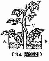 20、如右图所示,剪去生命活动旺盛的一根新鲜月季枝条,取两只烧杯,A杯内盛有30%的红色溶液,B杯内盛有红色溶液(红色物质对植物无害)。将月季枝条基部纵剖开,分别插入两个烧杯的溶液中,过一段时间后会发现: