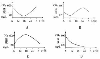 67、可作为塑料温室大棚的“气肥”,施用后增产效果明显,科研人员为了有效掌握向大棚内使用“气肥”的时机和用量,测定了一个密闭蔬菜大棚的CO2浓度,发现一昼夜在120--600mg/L之间波动,变化幅度远大于室外。以下是A、B、C、D四位同学绘出的该密闭塑料温室蔬菜大棚内CO2浓度的曲线,其中正确的是(若晴天日出日落时间分别为6:00和18:00)