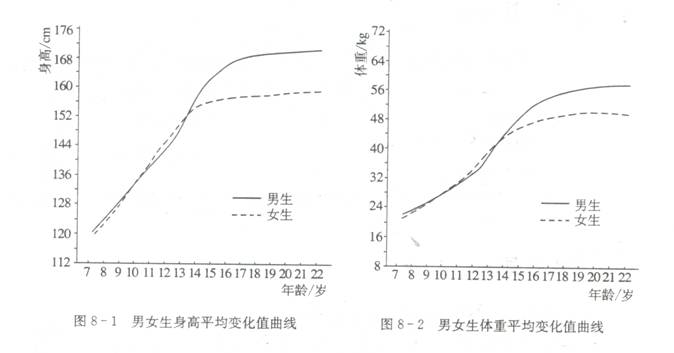 身高增加最快的年龄段大约是__________;由图8-2可以看出,男生体重