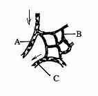 38.右图是显微镜下观察到的小鱼尾鳍内的一部分血管的分枝情况,箭头表示血流的方向,请据图回答: