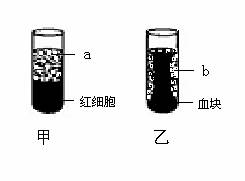 将新鲜血液注入甲、乙两支试管中,其中甲内放入几滴某物质,然后把两管静置一段时间,结果如右图。请你据图中血液状态回答: