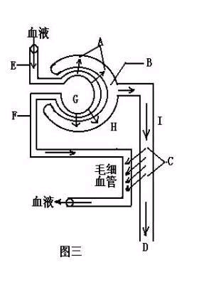 (3)液体在A过程中,除了血液中的血细胞和大分子的蛋白质以外,血浆中的一部分水分、无机盐、和尿素、尿酸等物质都可以通过;而在C过程中,对人体有用的物质,如大部分的水、全部的葡萄糖和部分无机盐被结构I重新吸收,并且进入包围在I外的毛细血管中,送回到血液里。