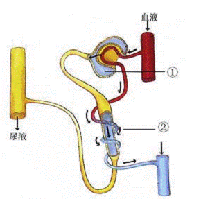 (1)图中①处所指的液体是指 ,与血浆相比,它不具有的物质是 ,而尿液与之相比,不含有的物质是 ,浓度增加物质是 。
