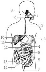 答案:(1)1→9→2→3→12→6→5→7 (2)8 唾液腺 10 肝脏 4 胰腺 唾液 胆汁 胰液 4 胰腺 胰液 (3)6 小肠 12 十二指肠
