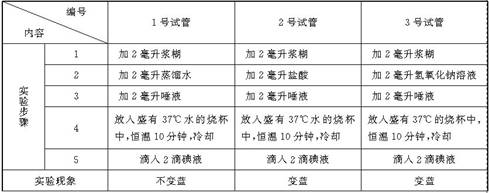 材料用具:试管、量筒、烧杯、滴管、石棉网、铁架台、酒精灯、温度计、新鲜唾液、淀粉浆糊、质量分数为5%的盐酸、质量分数为5%的氢氧化钠溶液、蒸馏水、碘液等。