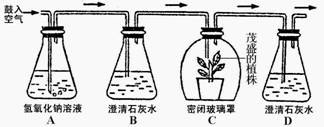 某研究性学习小组的同学欲用下列装置探究“绿色植物呼吸过程中是否有二氧化碳气体产生”,其操作设计如下:①将整套装置放在温度较低的暗室中;②通过A装置鼓入适量的空气;③静置一定时间后取出观察。请分析回答:(5分)