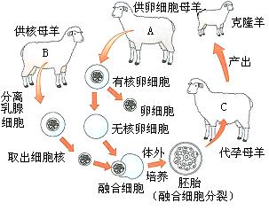 (2)发育成小羊多莉的卵细胞核来自于_______妈妈,细胞的其它部分来自于_____妈妈,卵细胞在______妈妈的子宫中发育。生出来的小羊多莉几乎跟______妈妈一模一样。