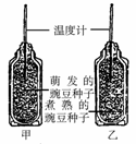 10.(2006·日照中考)下图表示在25℃条件下研究种子萌发过程中温度变化的实验装置:取甲、乙两个暖水瓶,甲瓶内装有萌发的豌豆种子,乙瓶内装有煮熟并冷却至25℃的豌豆种子,两瓶均用包有温度计的棉团塞严。能正确表示几小时后温度计读数的是( )。