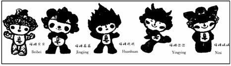24.(2007·济宁中考)福娃是北京2008年第29届奥运会吉祥物,每个福娃都有一个琅琅上口的名字:“贝贝”“晶晶”“欢欢”“迎迎”和“妮妮”,当五个福娃的名字连在一起,你会读出北京对世界的盛情邀请:“北京欢迎您”。福娃们带着北京的盛情,将祝福带往世界各个角落,邀请各国人民共聚北京,欢庆2008奥运盛典。