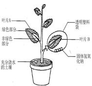 (3)将实验装置放到阳光下4小时后,同时摘下叶片A、B,利用 进行脱色处理,然后滴加碘液,观察实验结果。(4)叶片A绿色部分和非绿色部分的结果比较,表明 。