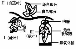 14、(2005 青岛)选取牵牛花的叶子进行如图所示的光合作用实验,图中第I、III号叶子为绿叶,II号叶子为白斑叶(部分为绿色,部分为白色)。请分析回答: