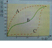 右图所示为你身体不同部位(或器官)生长速度的曲线图,其中,能代表生殖器官的是曲线