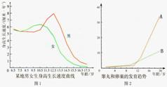 (3分)身高突增和性器官迅速发育是青春期的显著特点,分析图1中的曲线,可知:男孩比女孩进入青春期 1-2年;请根据图1的曲线变化规律,判断出图2中A的结构名称 ,B 的结构名称是