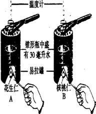 47.(9分) 某小组的同学想知道花生仁和核桃仁所含能量是否一样,他们设置了如图所示的实验装置进行探究,请根据实验回答:(注:1毫升水,每升高1℃,需要吸收4.2焦的热能)