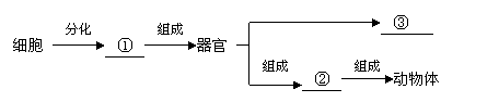 (1)下面是生物体结构层次图解,请将图解填写完整:① ;② ;③ 。