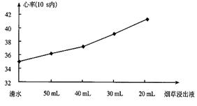 15℃的室温条件下,用10只大小一致、10秒内水蚤跳动范围在30-36次之间的成年水蚤,做了A、B两组实验,观察水蚤10秒内心跳次数;四份等量的香烟烟丝中分别加入20mL、30mL、40mL、50mL的蒸馏水浸泡1天的浸出液。