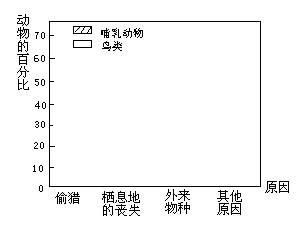 画图:画一个可以对比哺乳动物和鸟类濒危或受威胁原因的直方图。纵轴表示每一种动物的百分比,横轴表示各种原因。