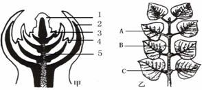 (1)图乙中的结构[A] 是由图甲中的[ ] 发育来的。
