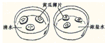 4.小明将一根新鲜的黄瓜切成若干薄片后,分别提泡在清水和浓盐水中(如右图所示),则哪种液体中的黄瓜薄片会失水变软[ ]