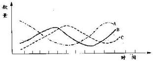 (7分)下图是一生态系统中,在一定时间内的三个种群的数量变化图,如果A为自养生物,请根据图分析: