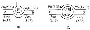 5、下面两图分别表示肺换气和组织换气,Po2和Pco2代表O2和CO2的分压(数值单位千帕).根据气体分压值的变化,可以断定图中血流方向是甲_______,